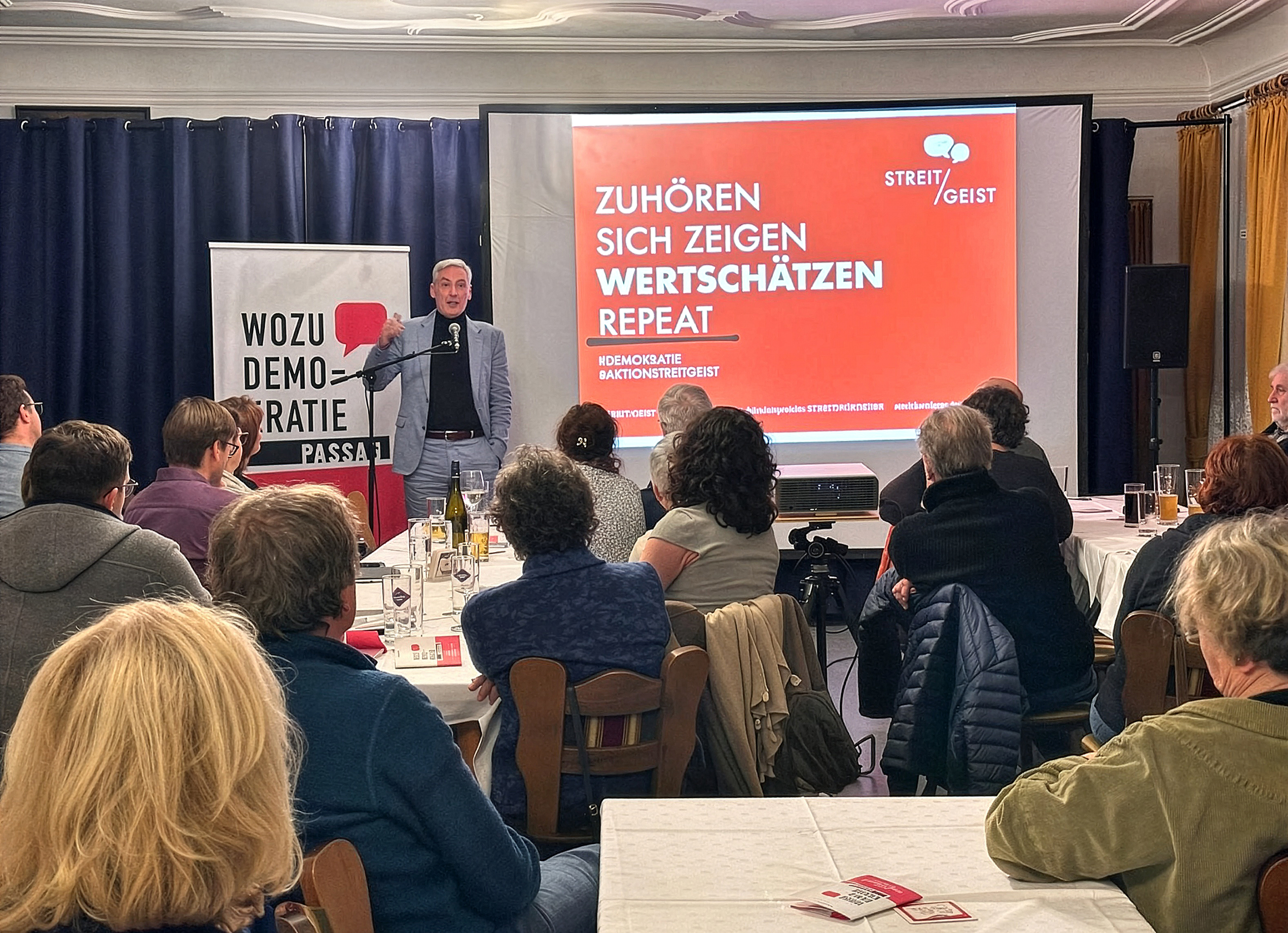 Thyrnau. „Mehr Streit wagen“ lautete das Thema der Informationsveranstaltung von Wählergemeinschaft Thyrnau-Kellberg und der KEB Passau, zu der Sebastian Dillinger 40 interessierte Bürger begrüßen konnte. Im Rahmen der „Wochen zur Demokratie“ war der Konfliktforscher Dr. Christian Boeser in den Edlfurtner Saal nach Thyrnau gekommen. Seine These: Streit ist lebensnotwendig. Feindseliger Streit sei jedoch genauso schlecht wie Streitvermeidung. Dies gelte im Großen wie im Kleinen, in der Demokratie genauso wie im zwischenmenschlichen Bereich. Unterschiedliche Werte und Interessen sowie das offene Austragen von Meinungsverschiedenheiten gehören wesentlich zu einer lebendigen Demokratie. Allerdings muss kultivierter Streit erst gelernt werden. Wir leben in einer nervösen Gesellschaft. Themen wie Zuwanderung oder Klimawandel polarisieren. Wenn man sich beispielsweise gegen Zuwanderung ausspricht, gilt man schnell als rechtsradikal. Will man Flüchtlingen helfen, gilt man schnell als „links-grün versifft“. Was ist guter Streit? Ein erster Schritt ist, im anderen keinen Feind, sondern einen Gegner zu sehen. Jeder kann und soll seine eigene Meinung haben. Wichtig ist eine gewisse Offenheit, um die Meinung des anderen zu verstehen. Das bedeutet nicht, dass man sie deswegen annehmen muss. Das setzt Interesse am Gegenüber und die Bereitschaft, Grenzen zu akzeptieren, voraus. Grenzverletzungen führen immer zu Gewalt, im Großen wie im Kleinen. Zudem ist es wichtig, sich großherzig Fehler und auch das Scheitern einzugestehen, auch sich selbst gegenüber. Der Wissenschaftler aus Augsburg empfahl, gegenüber Populisten skeptisch zu sein, aber auch gegenüber Menschen, die einen selbstgerechten Absolutheitsanspruch haben – und durchaus auch gegenüber dem kleinen Populisten in sich selbst. Wichtig sei es immer wieder – auch sich selbst – zu fragen: „Was, wenn du dich täuschst?“ „Sprechen Sie mit denen, die eine andere Meinung haben!“, empfahl er und fügte hinzu: „Nicht vergessen: Nach dem Streit ist vor dem Streit.“ Zusammenfassend könne man „guten Streit“ letztlich auf vier Begriffe reduzieren: „Zuhören“, „sich zeigen“, „wertschätzen“ und „repeat“, also wiederholen. Langanhaltender Applaus unterstrich die gleichzeitig hohe Qualität und bürgernahe Sprache von Dr. Christian Boeser, den Barbara Schwarzmeier von der Katholischen Erwachsenenbildung als Referenten gewinnen konnte. In der anschließenden Diskussion ging es unter anderem um die Streitkultur in den sozialen Medien, in denen häufig unter dem Deckmantel der Anonymität sehr krass und enthemmt gestritten wird. Angesichts der vielen Megakrisen – wie der Corona-Pandemie, der Migration, den Kriegen in der Ukraine und in Nahost – sei unsere Gesellschaft derzeit sehr nervös. Umso wichtiger seien Gespräch und Meinungsaustausch, also „guter Streit“.